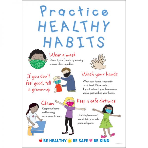 Barker Creek’s Practice Healthy Habits Poster visually summarizes several CDC and Public Health guidelines to help stop the spread Covid-19. With its child-friendly illustrations, the poster reminds children to use “airplane arms” to help maintain social distancing, wear masks when in public, wash their hands frequently, keep their surroundings clean, and tell a grown-up if they don’t feel well. This poster measures 13-3/8″ wide x 19” high and is printed on sturdy 12 pt. cardstock.