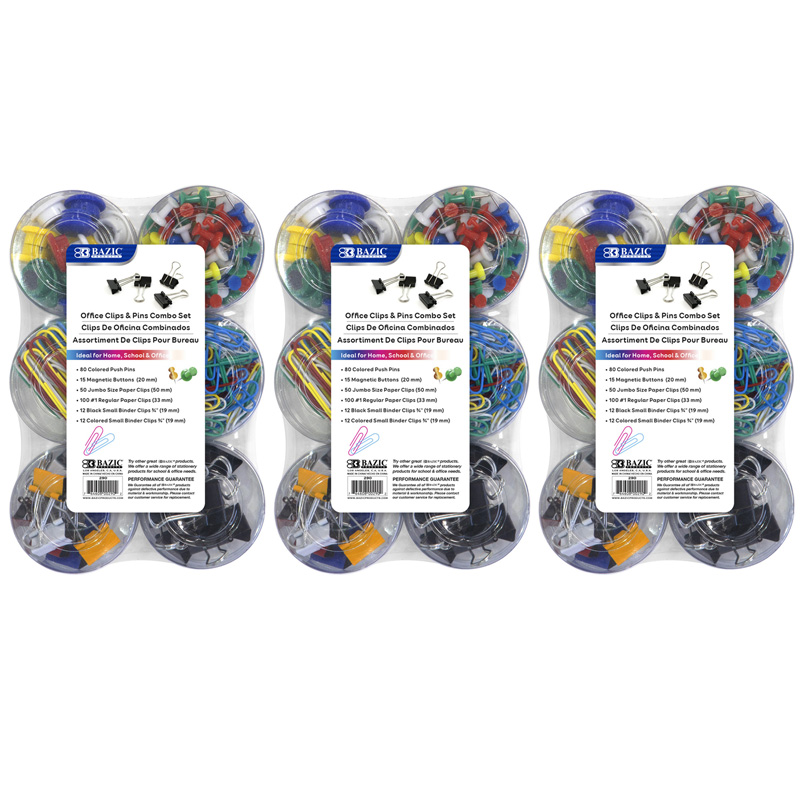 BAZIC® Push Pin, Paper Clip, Binder Clip, Magnetic Button Combo Set, 269 Pieces Per Set, 3 Sets