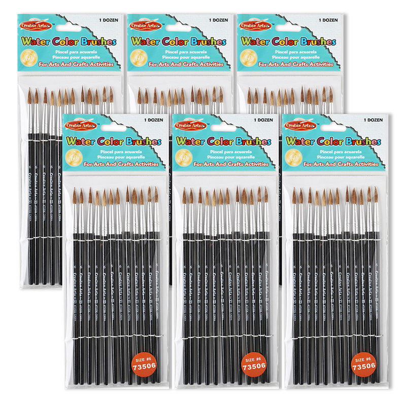 Pointed round head brushes feature dine camel hair. Seamless aluminum ferrules are double crimped to standard length hardwood handles. Great for watercolors, and all-around school, hobby and craft use. Number 6 brushes are 11/16″ long. Each pack includes 12 brushes. Sold as 6 packs for a total of 72 brushes.