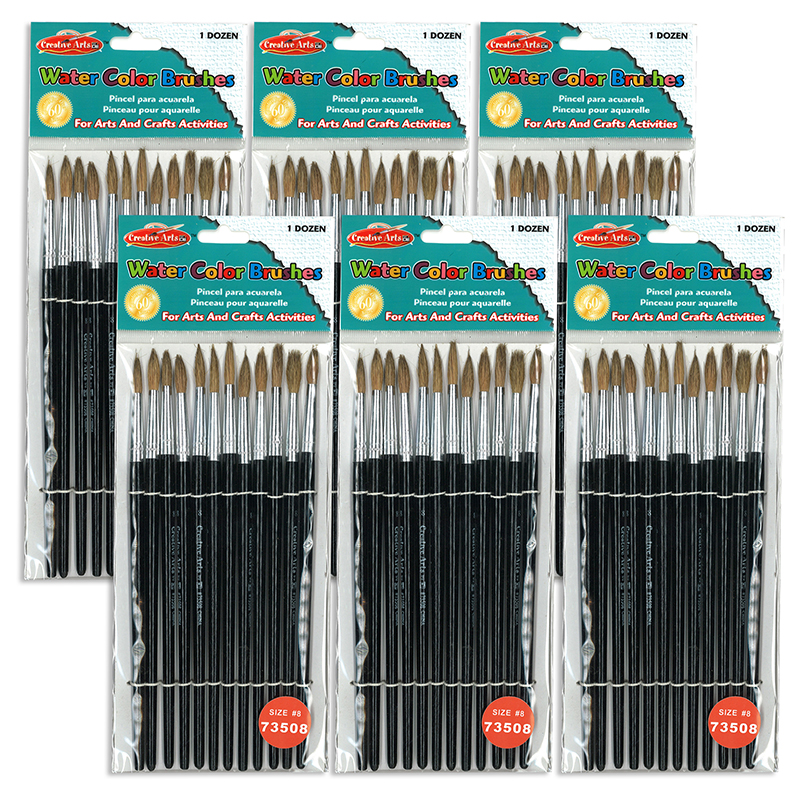 Pointed round head brushes feature dine camel hair. Seamless aluminum ferrules are double crimped to standard length hardwood handles. Great for watercolors, and all-around school, hobby and craft use. Number 8 brushes are 13/16″ long. Each pack includes 12 brushes. Sold as 6 packs for a total of 72 brushes.