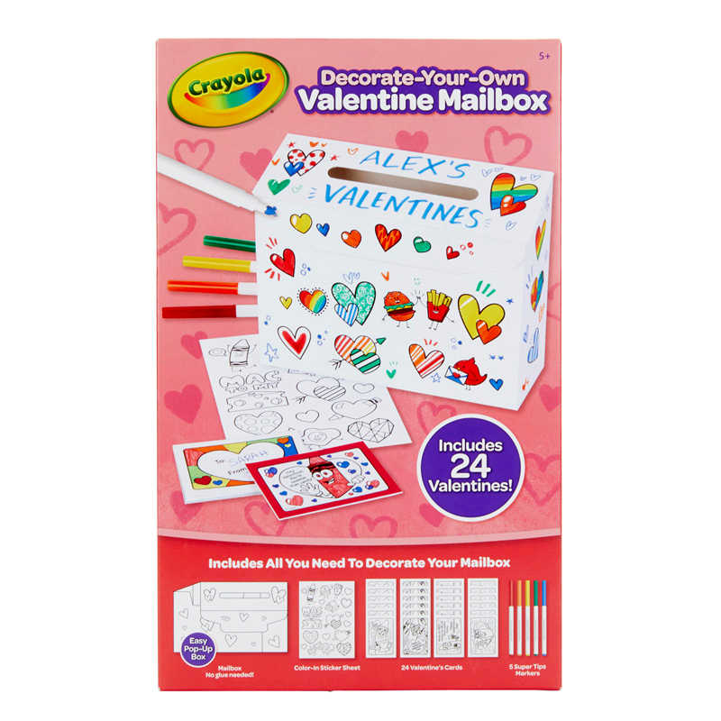 The Crayola Valentine Mailbox Kit offers kids a DIY box to collect all of their Valentine greetings from classmates and friends! It also comes with 24 Valentine cards to color and decorate with the included 5 Super Tips Markers and sticker sheet. Perfect for Valentine exchanges at school—ideal for storing cards and candy. This easy and fun Valentine craft is perfect for kids ages 4 and up.