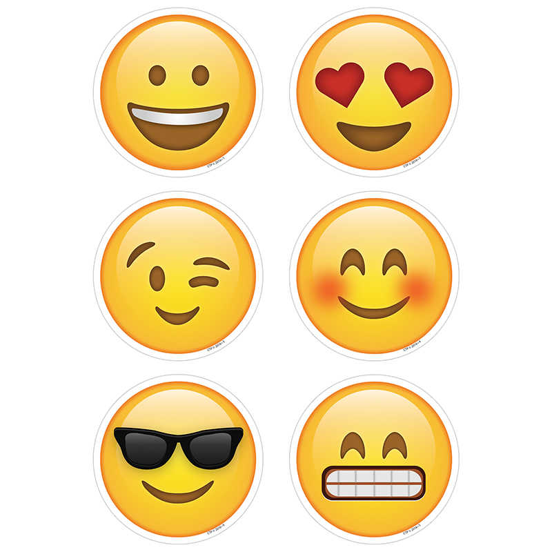 Sweet and silly Emoji’s 3″ cut-outs bring a little social media style and fun to the classroom. Pack includes six emoji designs: heart eyes, winking, smiley face, blushing smiley face, tooth-grin smiley face, and smiley face with sunglasses. Students will love these emoji faces.