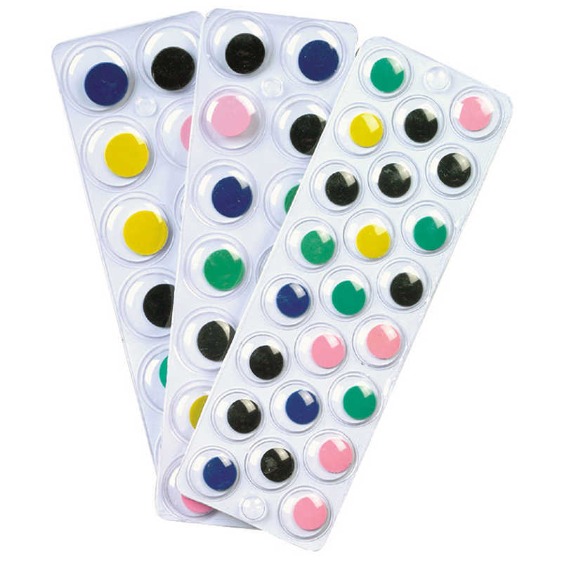 Wiggle Eyes bring projects to life! These convenient Peel and Stick Wiggle Eyes are easy to adhere to different surfaces. Sheets include 60 eyes in three sizes: 23 pieces of 15 mm, 20 pieces of 18 mm, and 17 pieces of 20 mm eyes. Ideal for the classroom, art room, daycare, or home.