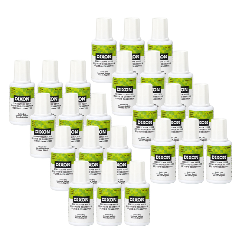 Dixon® Correction Fluid provides superior coverage of most inks. Fluid is applied with a synthetic brush and dries quickly. Fluid requires no thinning. The non-toxic, white formula can be used at home, school or office. Each bottle contains 20 ml/.7 oz. Sold as a pack of 24 bottles.
