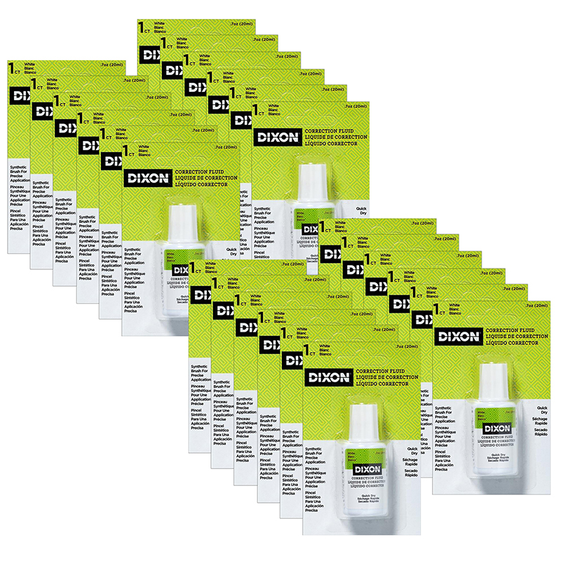 Dixon® Correction Fluid provides superior coverage of most inks. Fluid is applied with a synthetic brush and dries quickly. Fluid requires no thinning. The non-toxic, white formula can be used at home, school or office. Each bottle contains 20 ml/.7 oz. Sold as a pack of 24 bottles.
