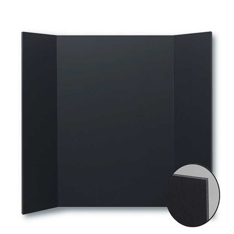 Take your presentation to a whole new level with a foam project board. Ideal for science fairs, art shows, business presentations and classroom projects! The smooth, bold black surface has a matte finish that easily accepts markers, crayons, paints and adhesives. Back of board and foam core are dark grey. Measures 36″ high x 48″ wide overall—side panels measure 36″ high x 12″ wide and the center panel measures 36″ high x 24″ wide. Pack of 10.