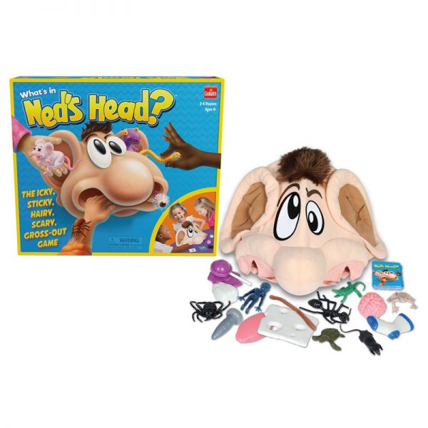 What’s in Ned’s Head? Reach inside his ears and nostrils, and find out! Each player is dealt a card with a picture of an object that is in Ned’s Head. Ready, Set, GO! Reach in Ned’s head and feel around for the object on your card. Who knows what you will find! A rat? A loose screw? Ned’s pet spider? Be the first player to find the correct object to win! For 2-4 players, ages 4 and up.