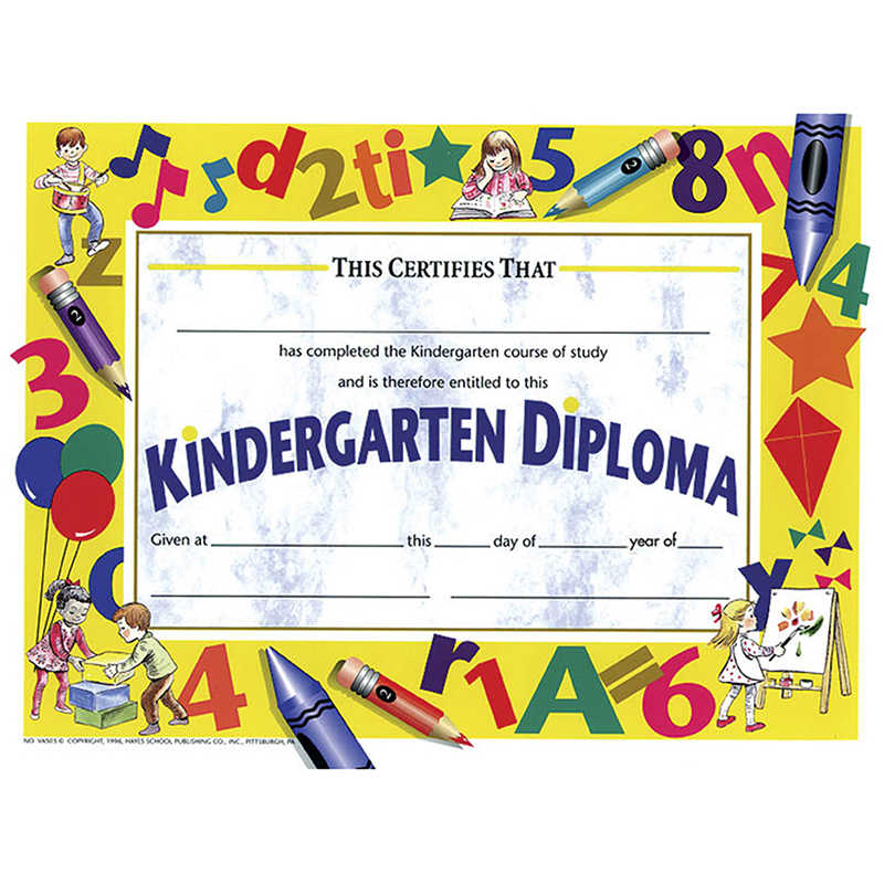 Diploma reads: This Certifies That _____ has completed the Kindergarten course of study and is therefore entitled to this Kindergarten Diploma Given at _____ this _____ day of _____ year of _____. The diplomas can either be handwritten or printed with a downloadable template.
