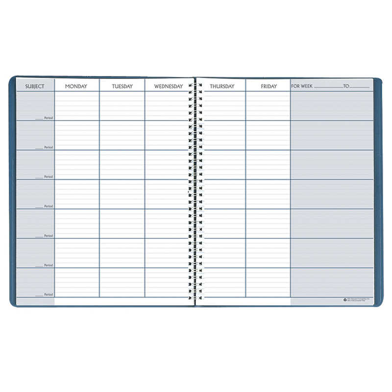 Includes seating chart, term program, test and attendance records. One week per two-page spread. 40 weeks / 7 periods. Days of the week are across the top and periods down the right hand side. Blue embossed simulated leather cover, non-refillable. Measures: 8 1/2″ x 11″. Printed on 100% post-consumer recycled paper with soy ink. Made in USA. Sold as a pack of 2 planners.