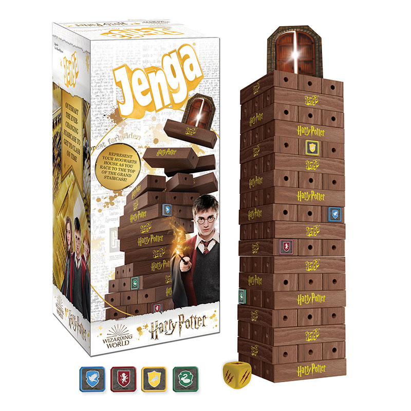 Climb toppling heights, scaling the Grand Staircase in this magical version of the classic stacking game! JENGA®: Harry Potter lets players represent their favorite Hogwarts house as the first student to reach the classroom door! Brave unpredictable challenges of removing and replacing blocks based on every roll of a custom die. For 1 or more players, ages 6+. Contents include: 54 Harry Potter JENGA Blocks, 4 Hogwarts House Markers, 1 Classroom Door with Base, 1 Custom Harry Potter JENGA Die, 1 Loading Tray and Rules.