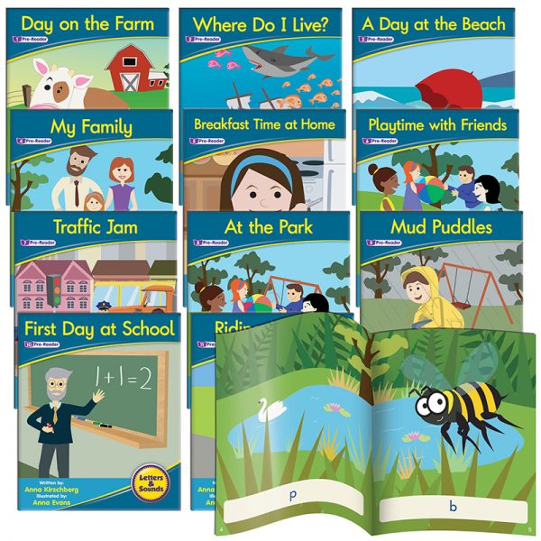Each phonemic awareness readers introduces 8 different letter sounds (phonemes).These readers have been designed for teaching phonemic awareness at the shared reading level. Letters presented in each text can be read by teachers using their phoneme sounds (i.e. ssss for letter S). Phonemic awareness is an understanding that words can be broken into small units of sounds. Set includes 12 fiction readers, each with colorful illustrations.