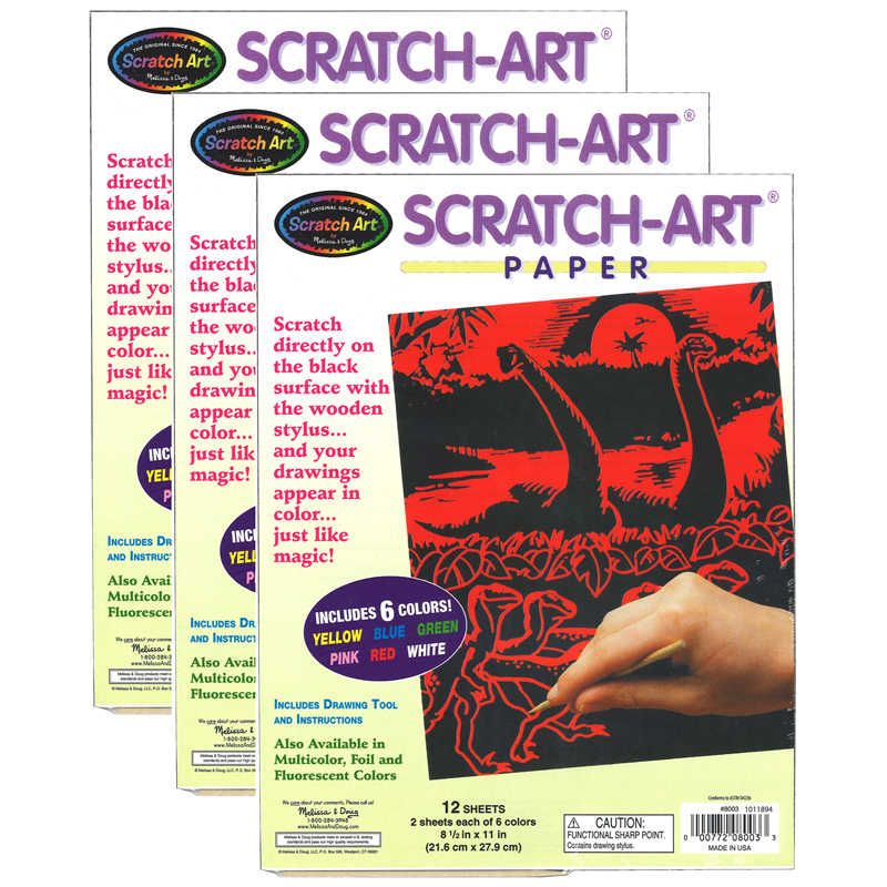 Create intricate line drawings with Scratch Art paper in solid colors. Simply scratch the coated sheets with the wooden stylus to reveal the bright, solid colors underneath. Economically priced and ideal for beginners. These colored sheets are coated with black ink that scratches away to reveal spectacular color. Each pack includes 12 sheets: 2 each of blue, green, pink, red, white and yellow. Wooden stylus included. Sold as 3 packs for a total of 36 sheets.