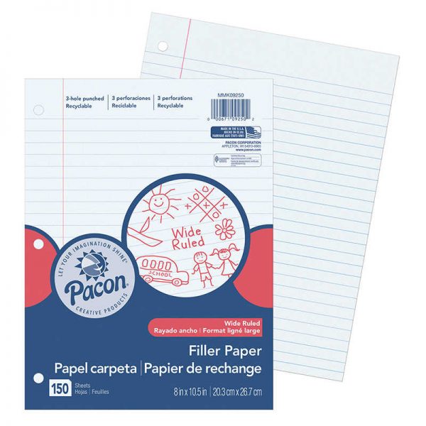 Quality filler paper for all your home and office needs. Smooth White paper is ruled on both sides, has a red margin and is 3-hole punched. 3/8″, wide rule. Measures 8″ x 10.5″. Includes 150 sheets.