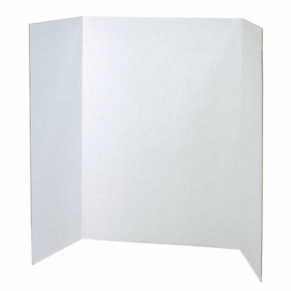 Presentation boards are tri-fold, single-wall corrugated display boards used for projects, booths, science fairs and all types of displays. Boards have a smooth, flat, uniform surface to accept many types of medium. Boards are White on the front and Natural Kraft on the back. The full display size is 48″ x 36″ and the board folds to 24″ x 36″. Recyclable.