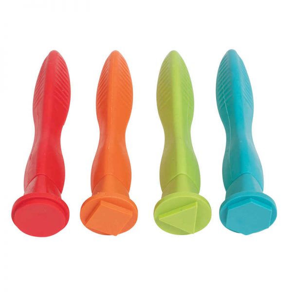 Create patterns in paint, clay and DIY projects with geometric Triangle Grip Stampers! This set includes 4 long stampers with triangular-shaped handles and 4 different geometric shapes: circle, square, triangle and hexagon. Ideal for those with special needs, Triangle Grip Stampers rest comfortably in small hands for greater artistic control. The triangle shape also promotes proper writing grip. Made of flexible rubber, these art tools are durable for endless painting, modeling and creating. Use them to decorate cards, notebooks and clay creations! As children create, they develop imagination, creative expression, hand-eye coordination and fine motor skills. For ages 2+. Size: 5.4″.