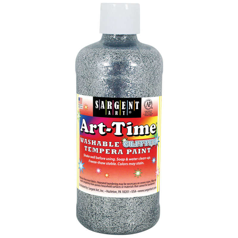 Sargent Art® Art-Time® Washable Tempera paints are economical for schools and artists. They can be washed from most fabrics and skin with soap and water. Our Washable tempera paints balance quality and affordability. All of our Art-Time® tempera paints are non-toxic and conform to ASTM D 4236. Includes 16 ounces of washable glitter tempera paint that is perfect for all projects.