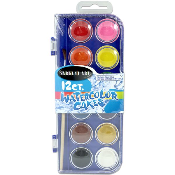 Sargent Art student watercolor cake sets are perfect for beginners and students and include a variety of brilliant colors. Inside of lid can be used as a palette to mix colors. This set is easy to clean up and store in included tray. Non-Toxic. Conforms to ASTM D 4236. Includes 12 colors and brush.