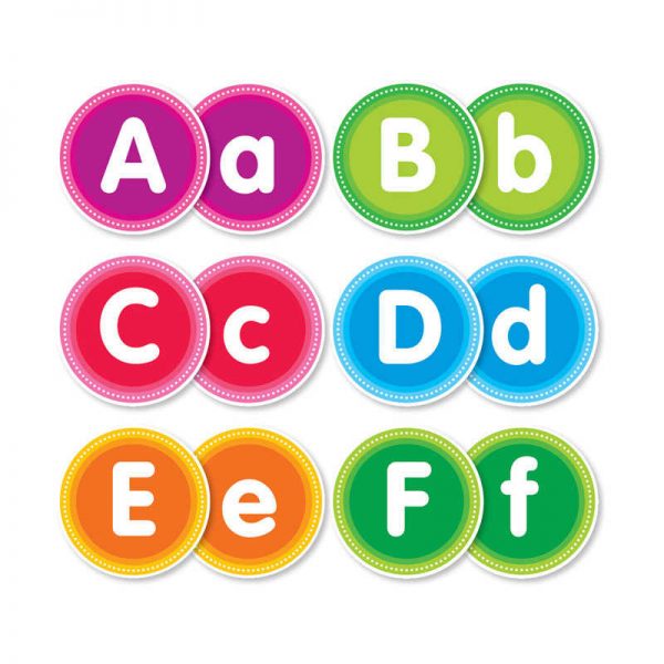 Package Contains: 26 uppercase letters (5” diameter); 26 lowercase letters (5” diameter); 3 blanks (5” diameter); teaching guide