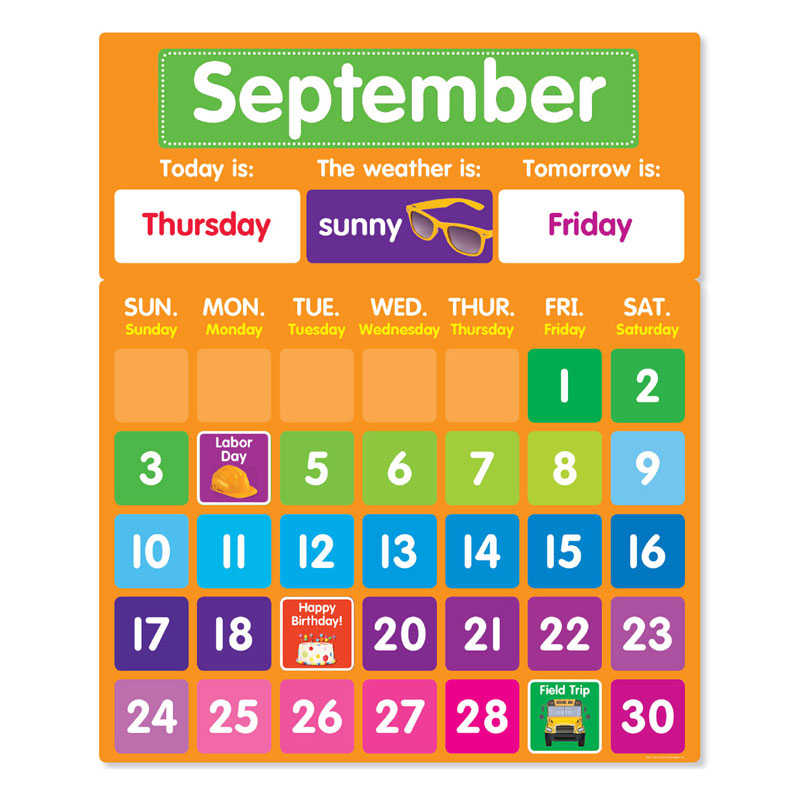 Package Contains: calendar frame (21.8” x 26.5”); 12 month cards; 7 day cards; 33 date cards; 5 weather cards; 45 event cards; 5 blank cards; teaching guide