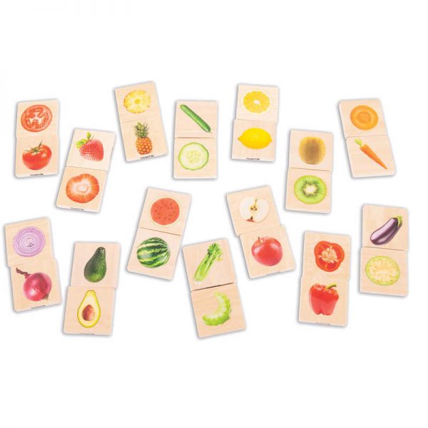 Matching game with real images of the outside of fruits and vegetables and corresponding images of their cross-sections. 14 pairs of smooth and tactile beech plywood square tiles, each color printed on one side with beautiful clear photographic images of real fruit and vegetables. The chunky tiles are easy for small hands to grip, rotate and turn over. Size: 2.8″ sides.