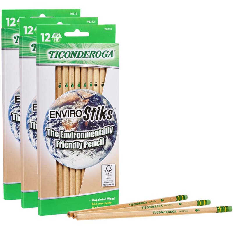 Envirostik™ Pencils are made from premium wood. They are topped with green latex-free erasers for clean corrections. These easy-to-sharpen #2 pencils use the exclusive Ticonderoga graphite core for smooth writing. PMA certified non-toxic. Each pack includes 12 pencils. Sold as 3 packs for a total of 36 pencils.