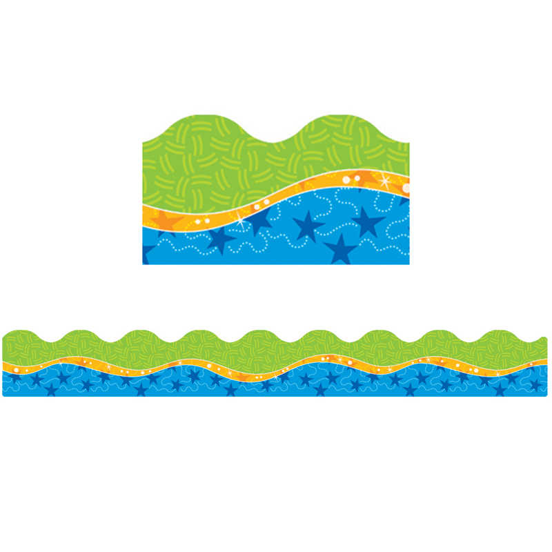 • Pre-cut, scalloped trim works with any bulletin board or display space. Attach with tape or staples.