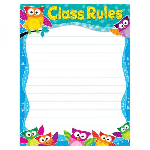 Get your students involved in creating class rules with this owl-some chart. Writing space allows you to customize for your teaching needs. Extra Value: Reproducibles on back. Durable. Measures 17″ x 22″. Coordinates with Owl-Stars!® Collection.