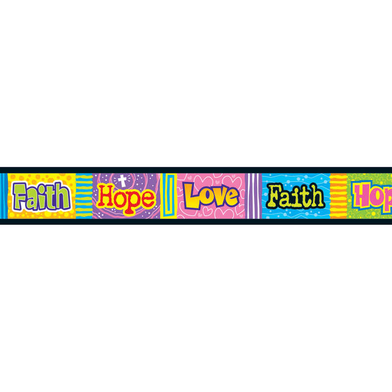 Faith, Hope, Love Bolder Borders®Straight-edge borders feature uplifting words and Christian themes that inspire any space. Designs coordinate with bulletin board sets to enhance displays and extend learning. Precut, durable, and reusable. 11 panels; 2 3/4″ x 39″. 35 1/4′ per pack.