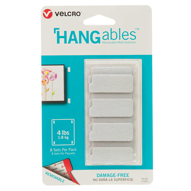 VELCRO® Brand HANGables™ Removable Wall Fasteners are the perfect way to decorate without damaging your walls. Hang frames. Create wall collages. Enhance any room with ease. Then, when you’re ready, use the easy peel tab to remove cleanly. These corner strips are perfect for hanging frames up to 12lbs (3lb per set). It’s the simple way to decorate worry free. Each pack includes 8 sets of 1-3/4″ x 3/4″ strips of removable wall fasteners. Sold as 3 packs for a total of 24 sets of fastener strips.