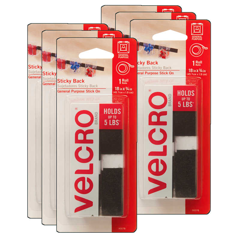 VELCRO® Brand Sticky Back fasteners are ideal for smooth surfaces and can be used indoors. Roll measures 18″ x 3/4″. Color: Black. Sold as 6 rolls of fastener tape.