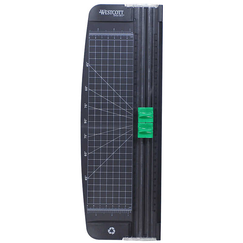Made from recycled plastic. Spring loaded blade for cleaner straighter precise cuts. Lift up arm for easier placement of paper. Cuts up to 5 sheets.
