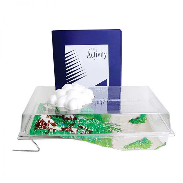 Our water supply is related to an overall series of events often referred to as the water cycle. In this context, the word “cycle” is used to mean a continuous repetition of like events – ; the movement of water molecules from bodies of water, the land, and living things on the land into the air and back again. To illustrate this process, two modes of presentation are used: The Water Cycle Model and a series of Study Cards. Make it rain in your classroom! Students can duplicate the individual processes of the water cycle, evaporation, condensation and precipitation with this ingenious, three-dimensional plastic model. Includes an eight page teacher-developed activity guide which fits into a three ring binder notebook along with the full-color overhead transparency for basic understandings to support classroom activity. Also includes a set of ten 8.5″ x 11″ colorful Water Cycle Study Cards which broaden the understanding of the water cycle and enhance awareness of the various states of water.