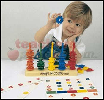 A splendid way for children to learn classification skills and develop logical thinking through fun play! Recognizing shapes and shape names, colors, counting, and grouping are just some of the learning possibilities. Kit includes fifty pieces with five different shapes and five different colors. The pieces are made with a center hole to fit on to the base which serves as an abacus. Eighteen pattern cards are also included, encouraging the following of directions and making a fun memory game. Learning is fun with the Shape N’ Color Coaster!