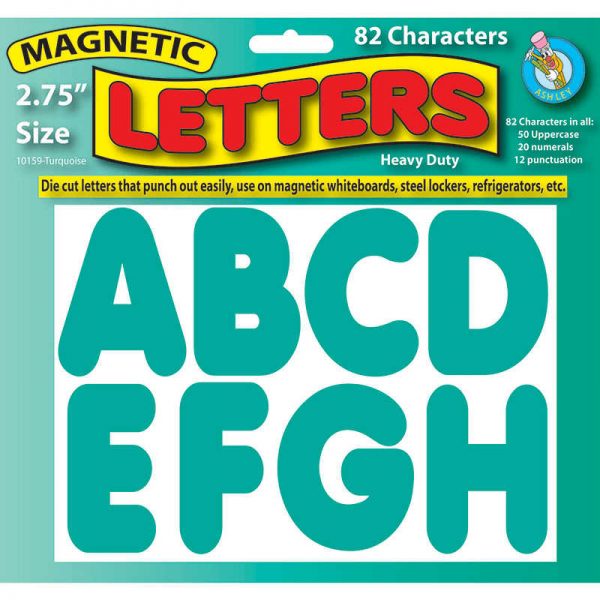 Turquoise color 2.75″ Magnetic Upper case Letters 82 pcs, 50 Letters , 20 numerals, 12 punctuation..punch them out…place them on magnetic whiteboards, steel surfaces, lockers, refrigerators