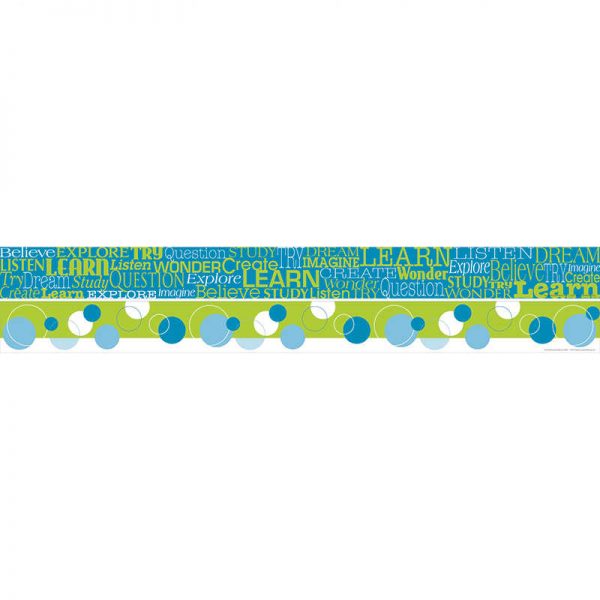 This Double-Sided trim features the words: believe, listen, dream, create, try, learn, study, explore, imagine and wonder, on one side and a bright, coordinating design on the other side! Inspire your class, office or family with this colorful trim! Designed to go with our dot.calm product line! These durable, bright borders are printed on thick, coated paper. Each package contains 12 strips — a total of 35 feet! Use our Borders to brighten bulletin boards, frame doorways, define learning centers, and celebrate special events!
