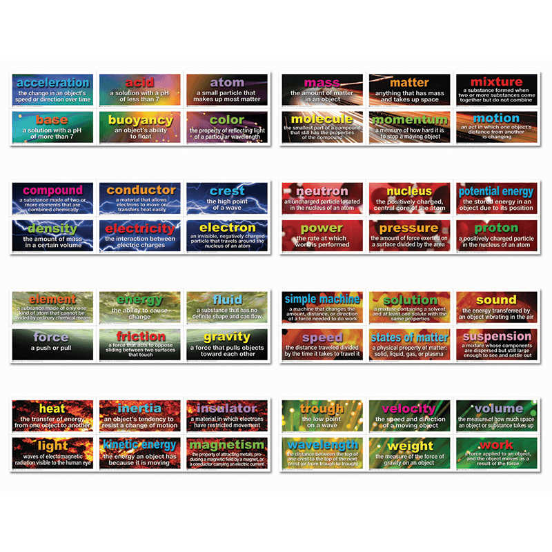 This eight-board mini bulletin board set features 48 physical science testing and vocabulary words with definitions that are die-cut to be punched apart and used as flash cards, or they can be displayed as a set. (8) 21″ x 6″ strips featuring 48 die-cut physical science testing and vocabulary words with a short, clear definition for each Place on a bulletin board or punch apart and use as flash cards Resource guide