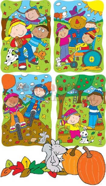 Set includes 6 fall scenes, approx. 11.5″ x 16.5″ each, 2 pumpkins, a leaf pile, a squirrel, an accent piece with 2 pumpkins, and 23 colorful leaves. A resource guide is also provided