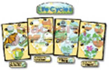 4 life cycle charts (butterfly, chicken, frog, and plant), each 17in. x 24in. 4 chart headers, each 11in. x 3.25in. Life Cycles header, 23in. x 7.25in. Resource guide.