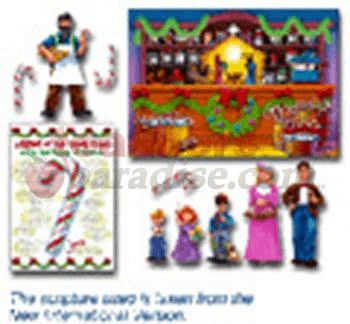 Candy shop with Nativity scene, 33.5in. x 24in. 6 story characters, largest measures 9.5in. x 17in. Candy cane chartlet, 17in. x 24in., explaining the Christian symbolism of the candy cane. 27 candy canes, each 3.5in. x 7.25in. Activity guide.