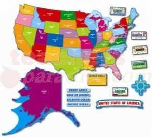 U.S. map, 39in. x 24in. (easy to assemble from 10 pieces) 51 license plates, 5in. x 2.5in. Alaska, 26in. x 24in. Hawaii, 1.75in” x 5.25in”. Legend. Compass rose. 4 Labels for major bodies of water. Header, 16.25in. x 3.25in. Resource guide.