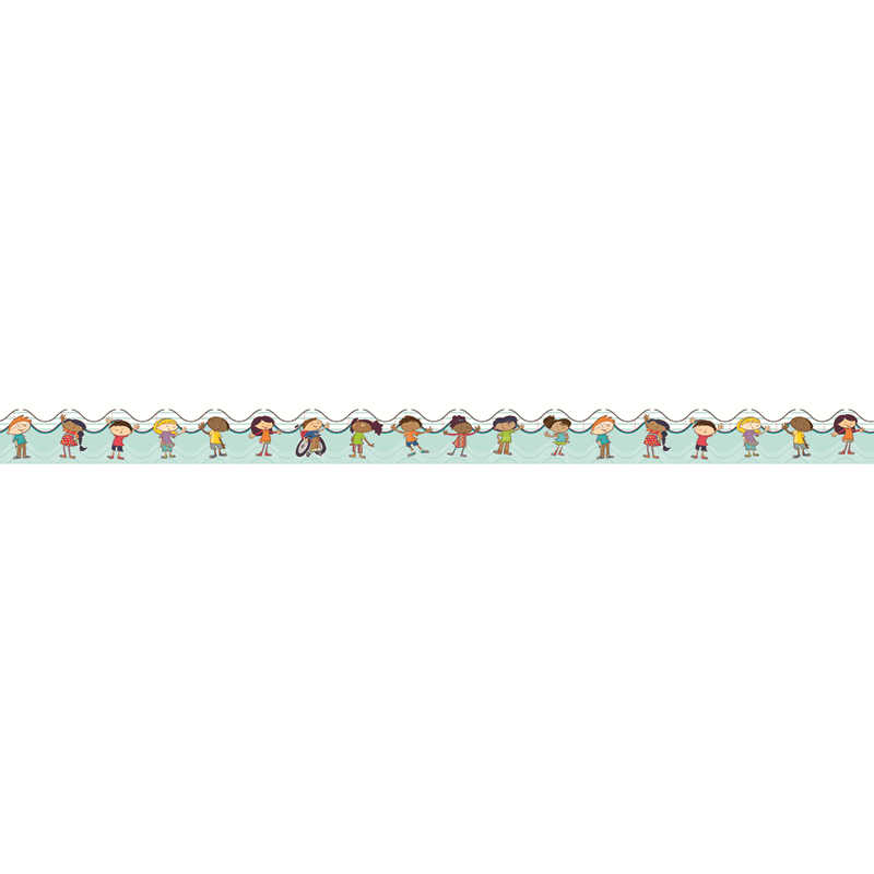 Add some cheerful color to your classroom with this delightful Kids scalloped border. This design will add color and personality to any class creation, bulletin board, window, or anywhere an extra fun touch is needed! Perfect to use alone or in layers, borders come in a pack of thirteen 3′ x 2.25″ strips for a total length of 39 feet! Look for coordinating products in this character theme and a full assortment of coordinating color palette designs to create an exciting, warm and cohesive classroom theme!