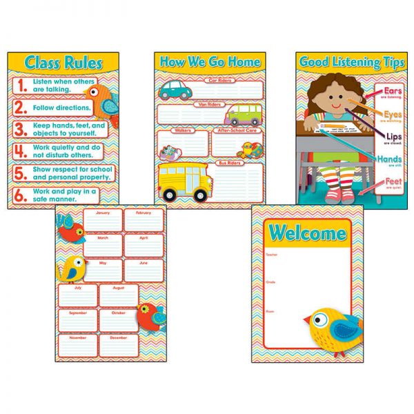 Bring color and energy to your classroom and organize in style with the Chevron Classroom Management bulletin board set. This set features 5 essential charts including a welcome chart for your door, a class rules chart, a class birthday chart, a transportation chart, and a good listening tips chart. Each eye-catching chart measures 17″ x 24″ and can be displayed all year long. This set also includes a teacher resource guide. Designed to help teachers expand contemporary decorative themes into their curriculum! Classroom setup, including decorations and color, provide a clear message to students about the environment and culture of the classroom. The new Chevron designer pattern is sure to bring new energy to your classroom and create an engaging, positive and fun learning environment.
