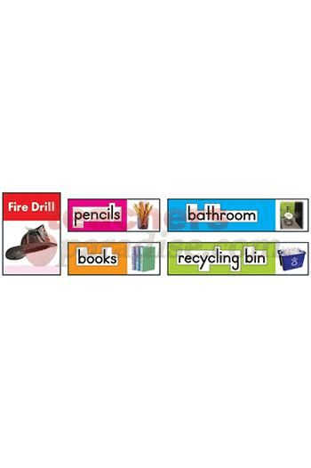 This set includes 30 photographic labels, largest approx. 12.5″ x 3.5″ and (4) 6″ x 8.5″ classroom management labels with front adhesive strip. “