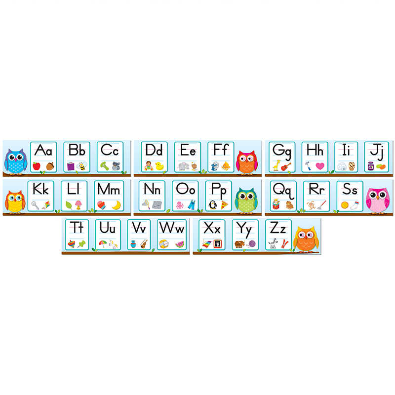 Support the development of language arts skills with the eye-catching, contemporary Colorful Owls Alphabet Mini Bulletin Board. Display this functional and vibrant mini bulletin board set in the classroom as a way to reinforce critical spelling and phonic skills. The Colorful Owls Alphabet Mini Bulletin Board includes 8 alphabet strips, 6″ x 21″ each, with lower and upper case letters. Each letter provides a corresponding short and long vowel sound example. Includes a Resource Guide. Colorful Owls are back and ready to help teachers expand contemporary decorative themes into their curriculum! Color and decorations in the classroom provide a clear message to students about the environment and culture of the classroom. The playful and vibrant Colorful Owls design helps teachers create a positive environment that promotes creativity, enthusiasm and productivity.