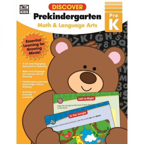 In Discover Prekindergarten, your child will learn about numbers, counting, addition, subtraction, patterns, sorting, shapes, attributes, location, measurement, data analysis, probability, writing readiness, and reading readiness. The Discover series offers creative and open-ended math and language arts opportunities for a fun approach to learning! In this book, your child will be encouraged to increase critical thinking and problem-solving skills with colorful and engaging activities. Each activity supports early learning standards and encourages children to connect with the essential math and language arts skills they are learning. Lessons help build a concrete example of math and language arts concepts. Each activity supports early learning standards and challenges your child’s critical thinking and problem-solving skills.