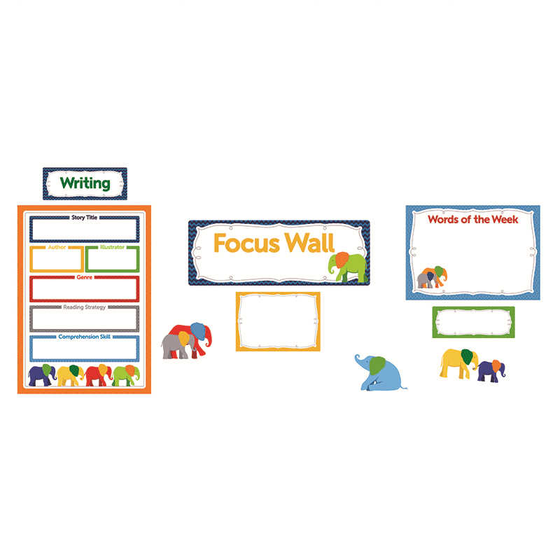 The Parade of Elephants Focus Wall bulletin board set offers teachers an engaging and simple way to present a theme and keep it in front of their classrooms. The set includes 1 header, 1 focus wall overlay, 2 large charts, 1 Words of the Week chart, 1 blank chart, 5 curriculum headers, 3 blank headers, and 8 elephant accents. A resource guide is included to enhance teacher instruction. The Parade of Elephants collection features the perfect blend of fresh, bright colors and popular patterns.