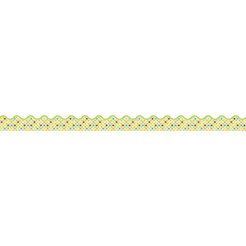 Add a contemporary touch to your classroom with the Hipster collection. Complement any classroom display with the Hipster Stardust scalloped border. Featuring a lime green stripe and overlapping white circles on a colorful background, this star-like design is a graphic twist on a classic pattern. A simple solution for accenting classroom displays, bulletin boards, windows, and doors, scalloped borders provide an easy, affordable way to create a colorful classroom. Each pack features 13 strips that measure 3 feet x 2.25 inches for a total length of 39 feet. Use these borders individually or cut and layer them to create your own special style. Be sure to look for other coordinating products to create a cohesive classroom theme!