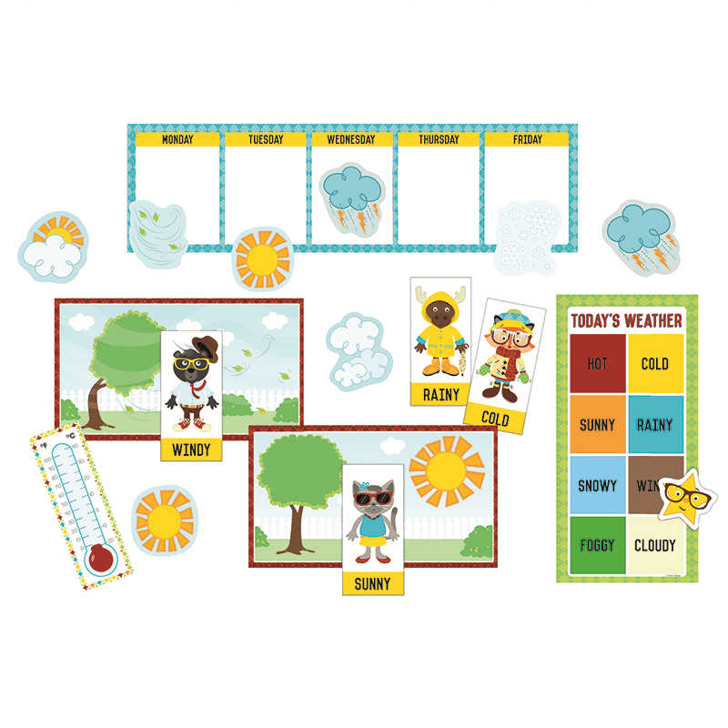 The 29-piece Hipster Weather mini bulletin board set encourages students to explore a fundamental science topic in a fun way. This interactive set teaches students to describe the day’s weather, track the week’s weather, choose appropriate clothes for various types of weather, and read a thermometer. Ideal for small spaces, curriculum-based mini bulletin board sets allow you to use valuable wall space for presenting standards-based concepts without sacrificing an inviting classroom atmosphere. These essential sets will appeal to your students, offering daily reinforcement that enhances the learning process. Be sure to look for coordinating products to create a cohesive classroom theme!