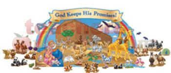 This bulletin board set includes: an ark scene, assembled approx. 50 inches x 24 inches; 25 die-cut animals; a God Keeps His Promises! banner; and an activity guide.