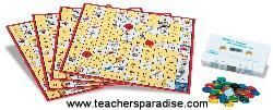 A fun way to learn multiplication tables. Players listen to the question and rush to put their marker in the correct answer. The sound effect tells them who is right. Includes four colorful playing boards, 40 transparent counters, and one cassette tape.